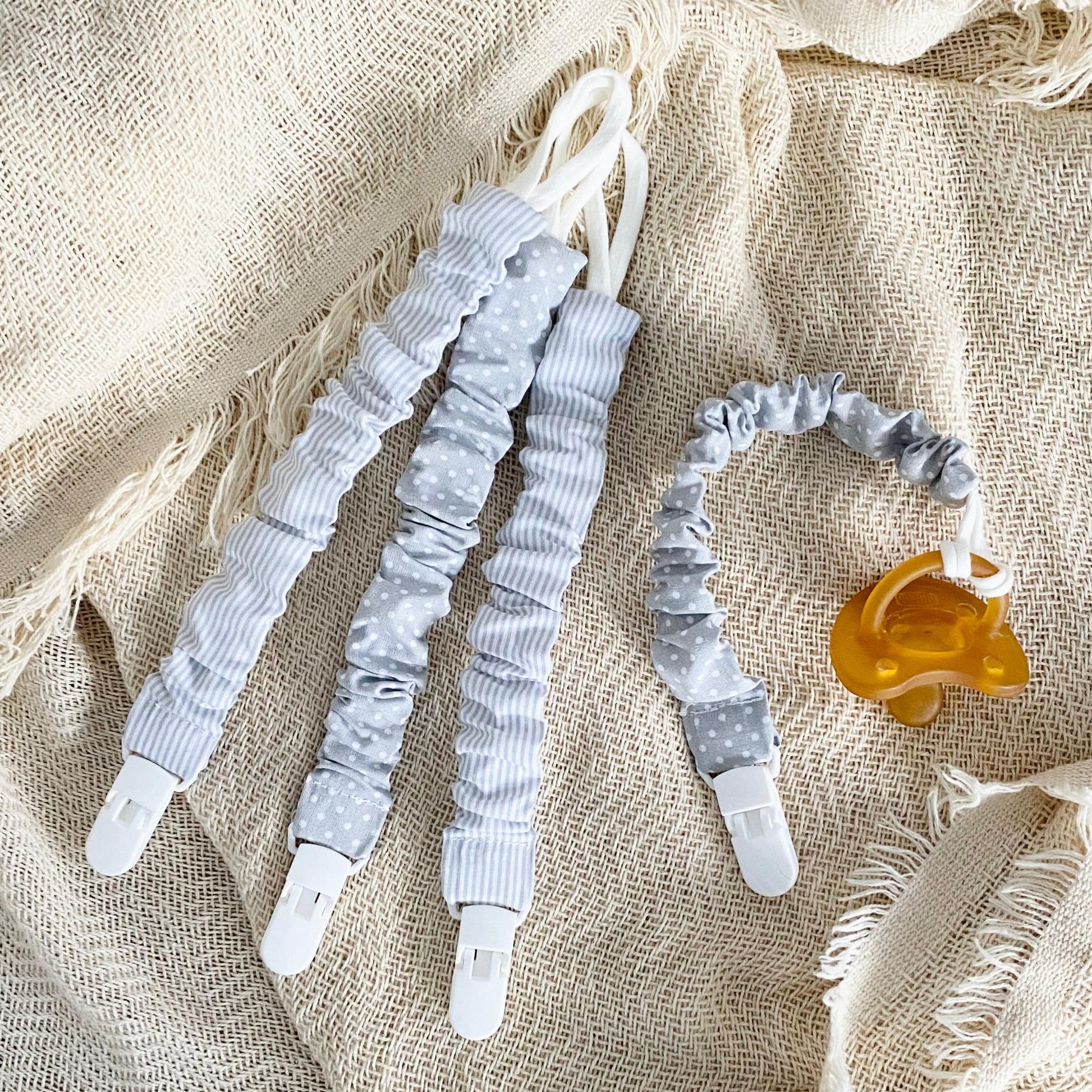 *Materials - Our Pacifier Clips are made using cotton fabric and plastic suspender clips.