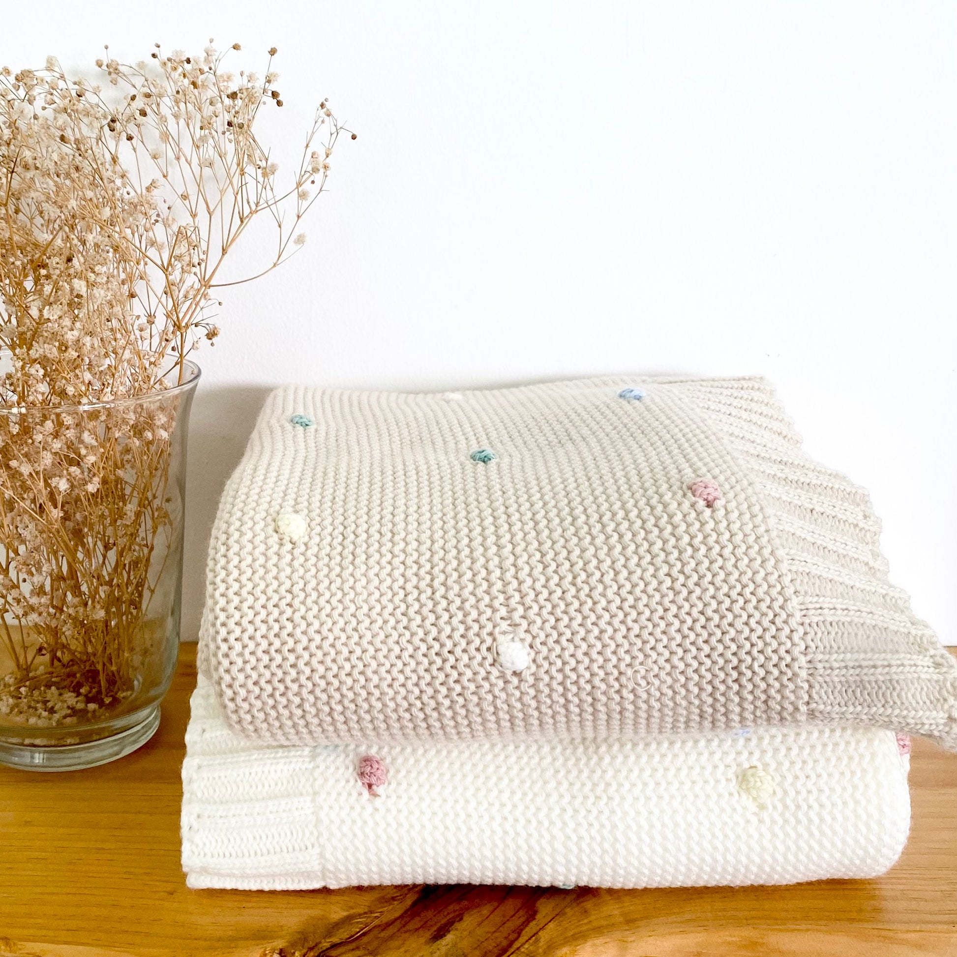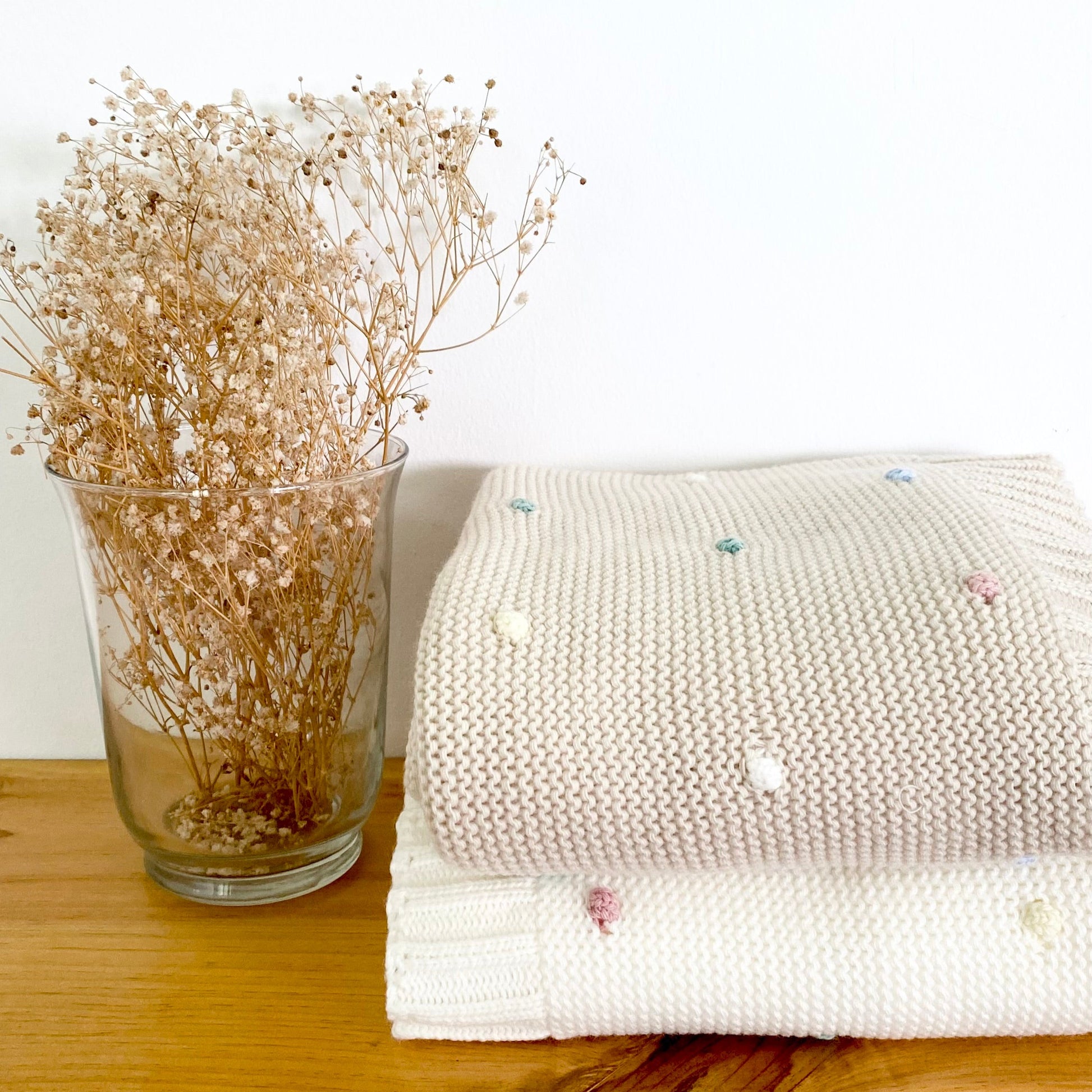 Uma manta muito macia e fofinha com pompons bordados de várias cores pastel - perfeita para acompanhar o seu bebé em todas as ocasiões. Um must-have!