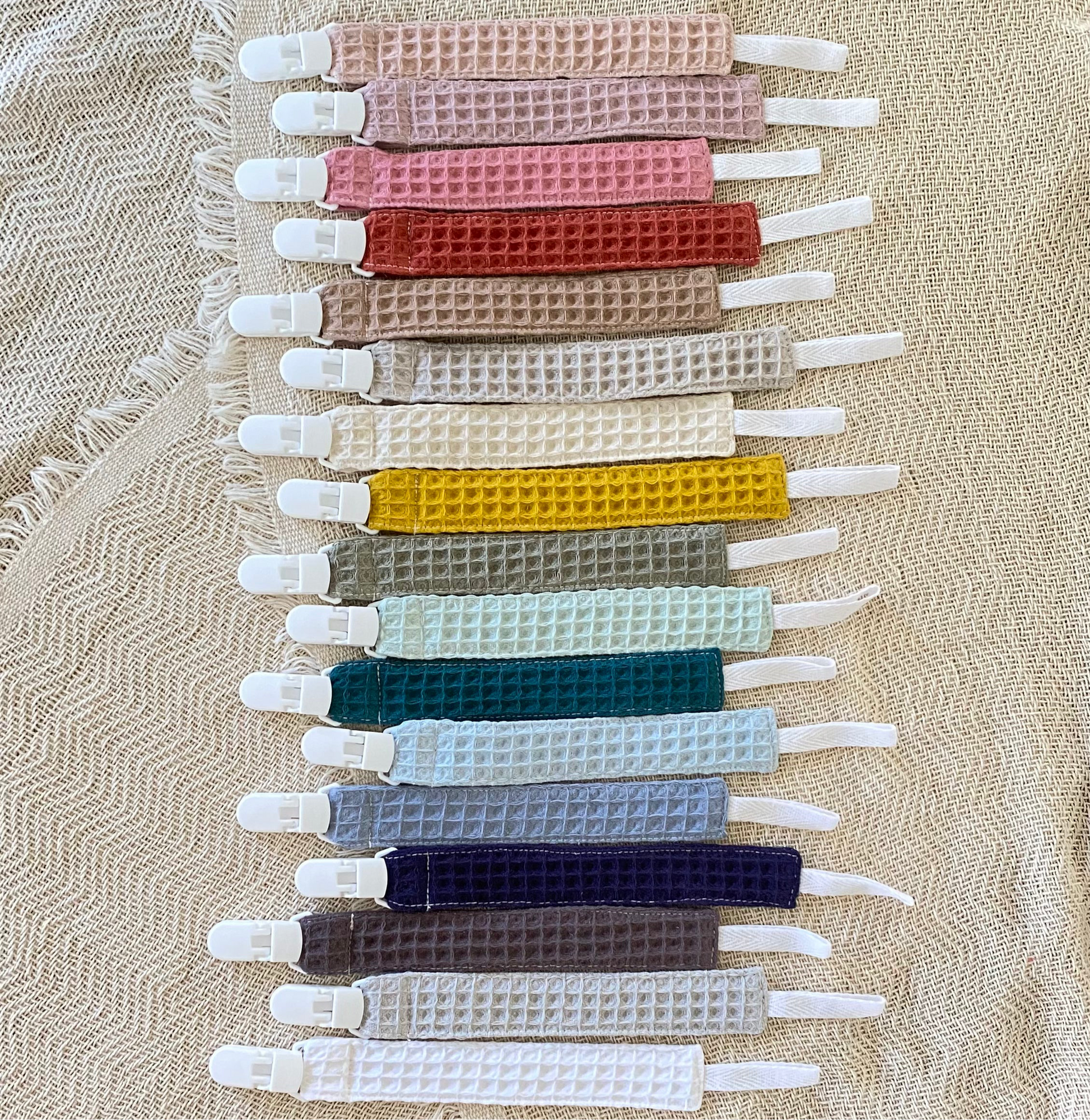 *Materials - Our Pacifier Clips are made using cotton fabric and plastic suspender clips.