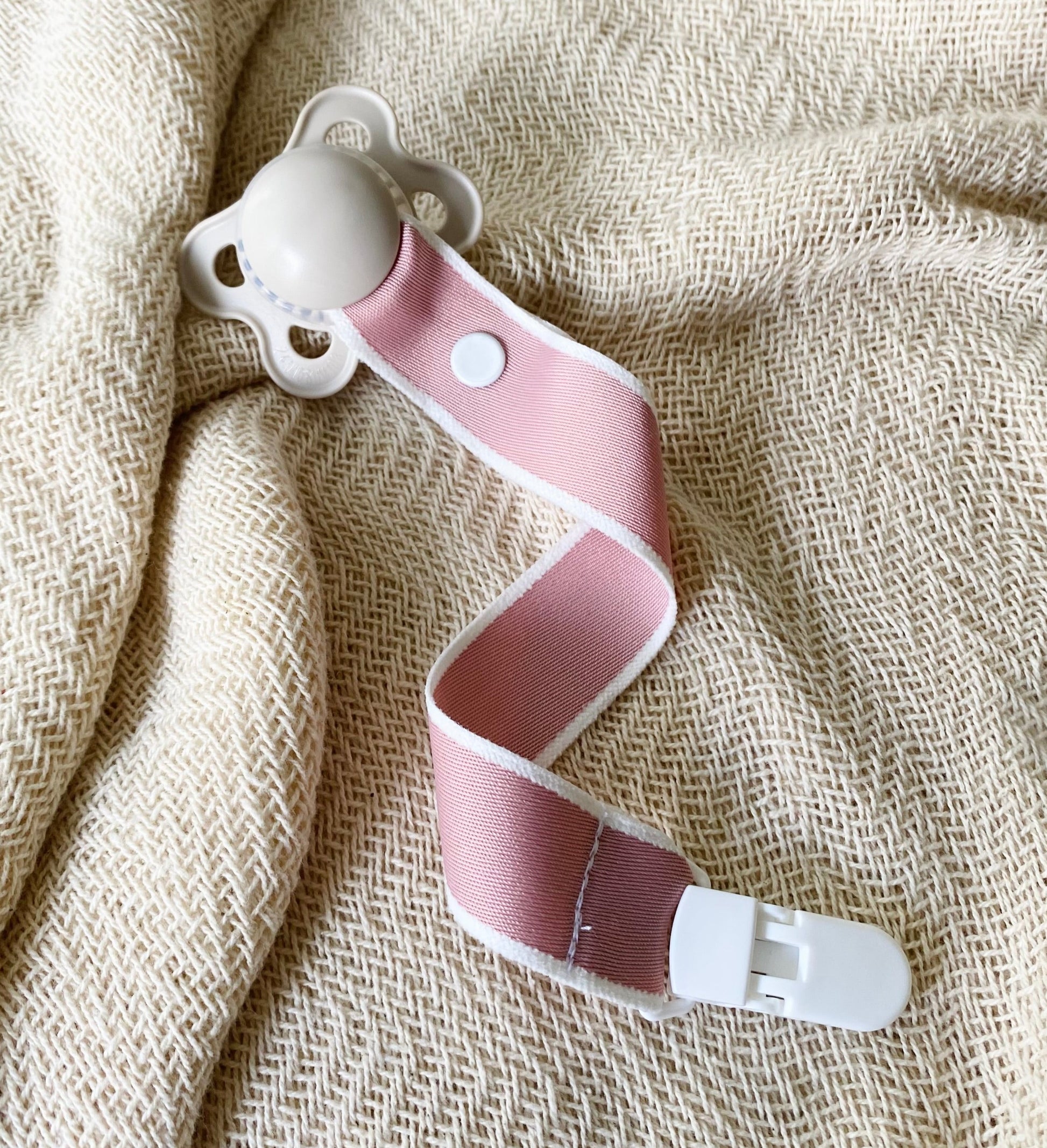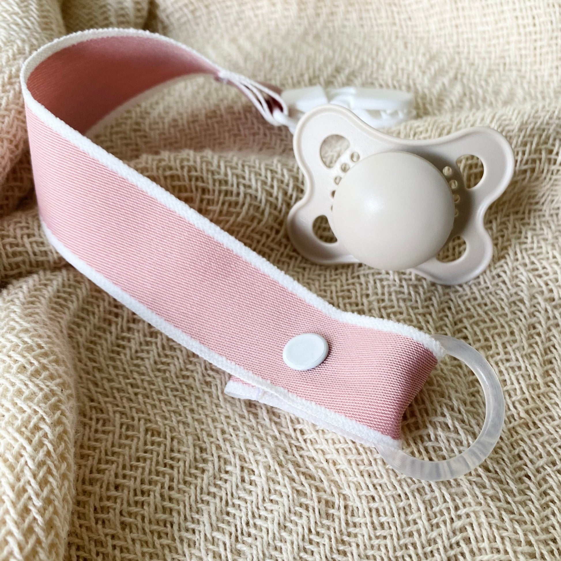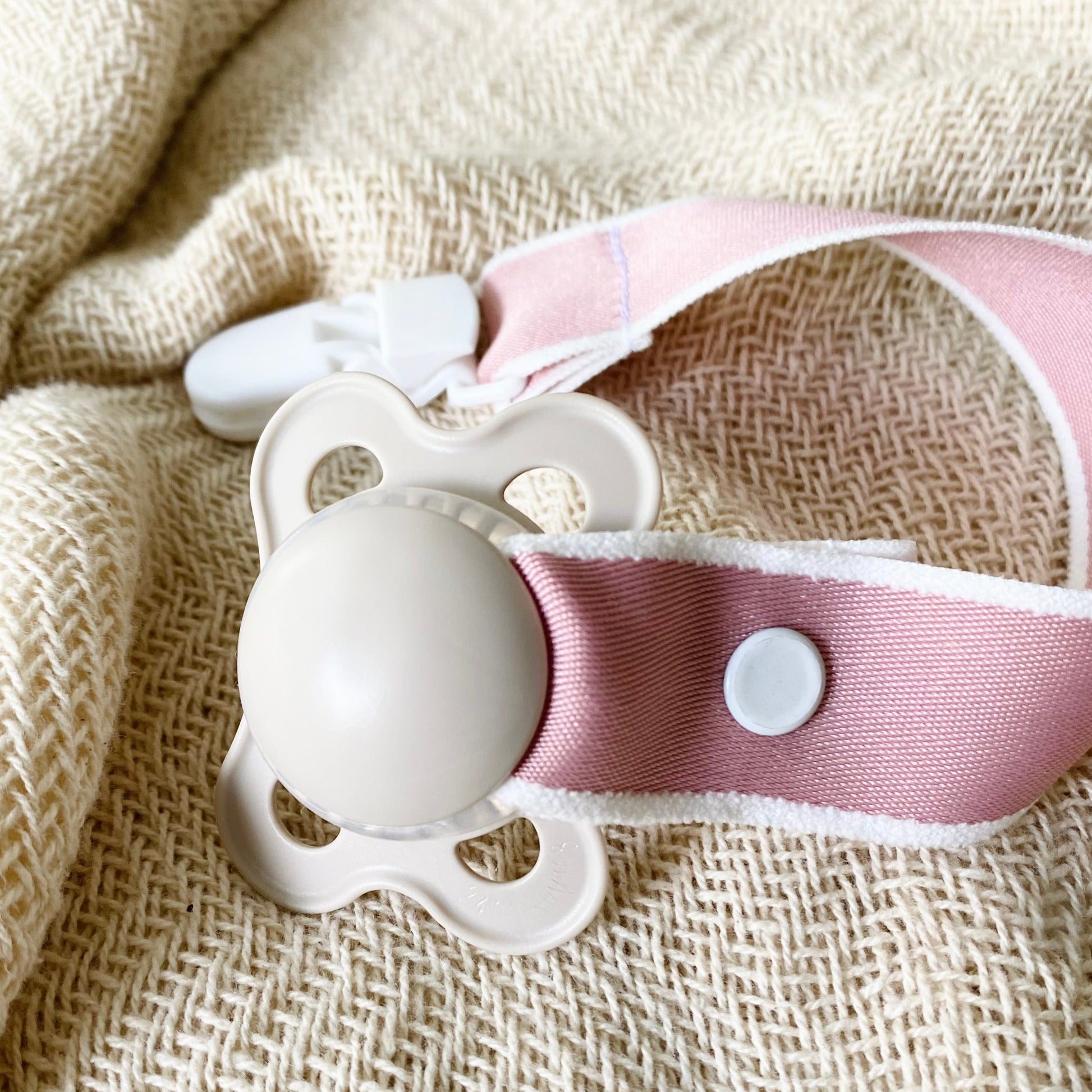 Con este adaptador de silicona transparente y discreto, puede colocar cualquier modelo de nuestros chupeteros en un chupete con botón. El silicona es un material fuerte y maleable que se estira para adaptarse a varios tipos de chupetes.