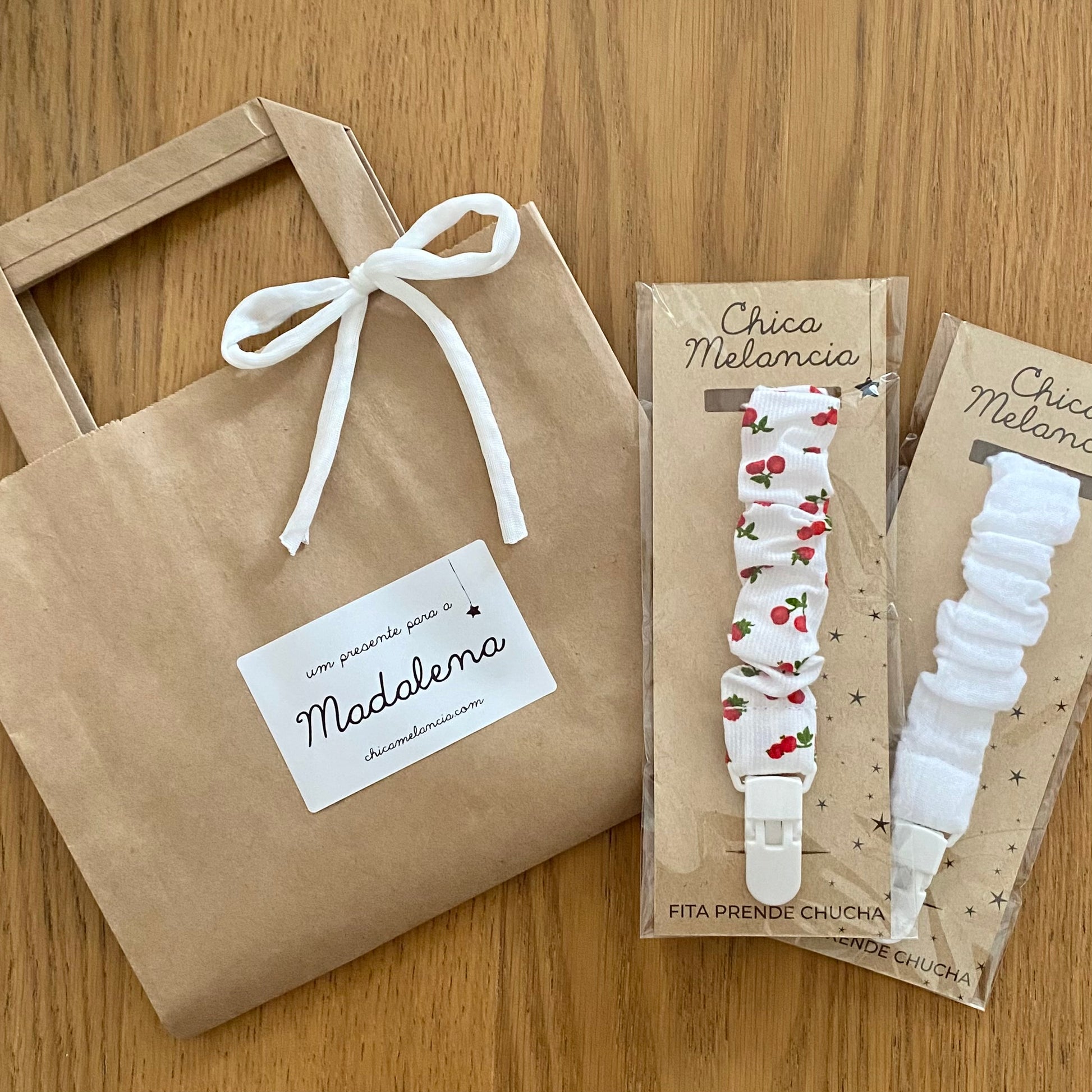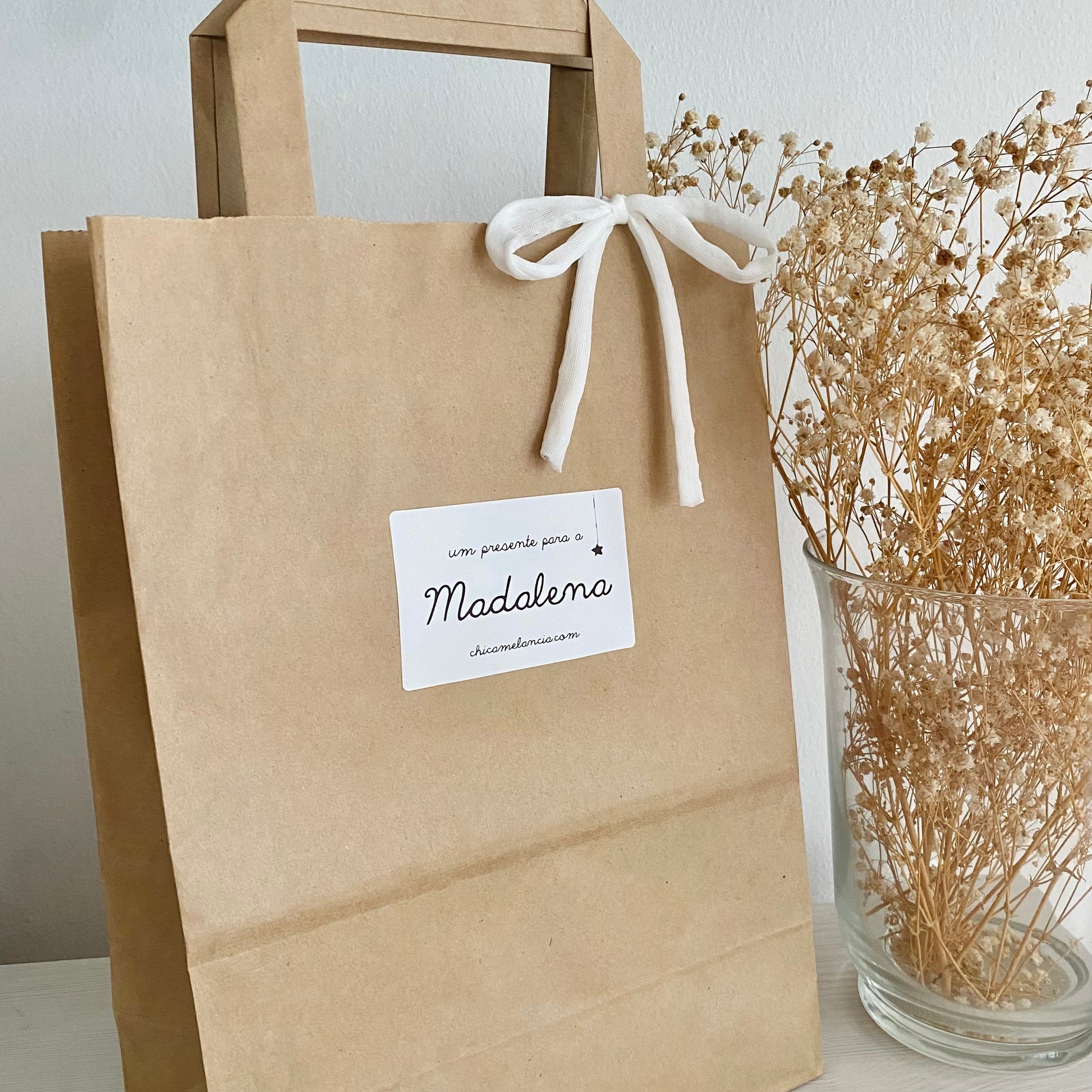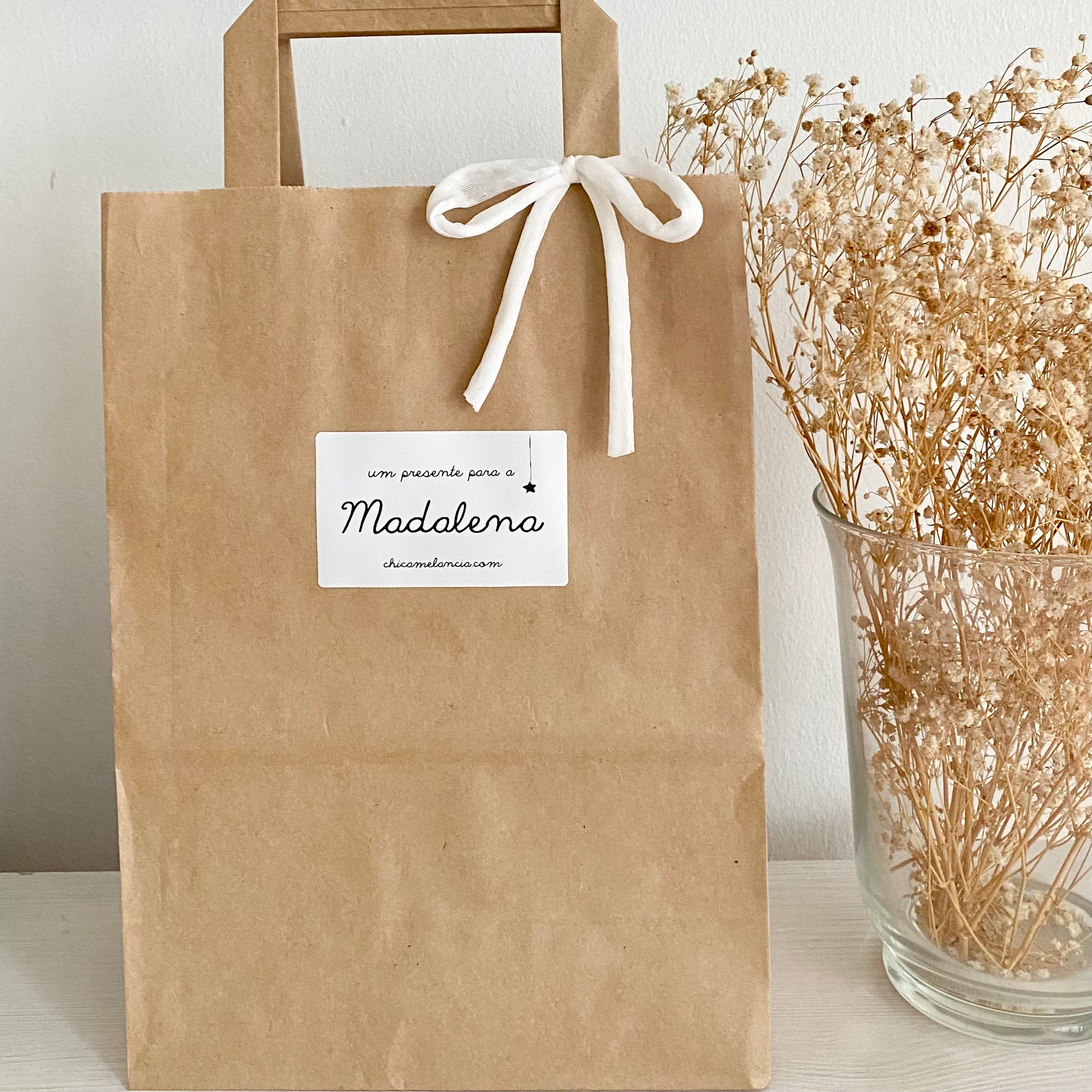 Incluído: Saco em Papel Kraft com Laço e Etiqueta Autocolante com Nome.